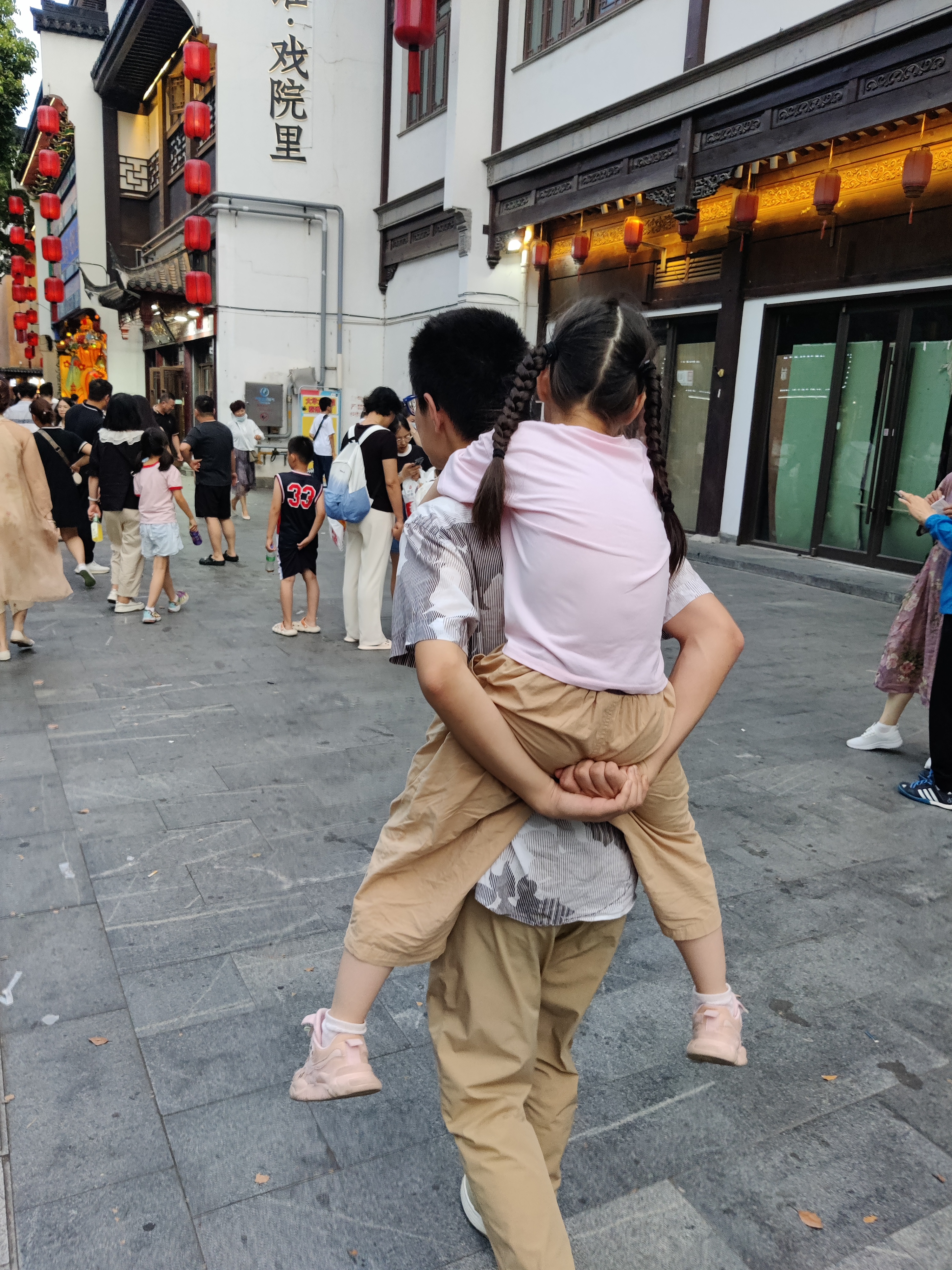 在南京的第二站是夫子庙,可能因为南京美食太过诱人小娃吃多了,地铁人潮汹涌拥挤不堪,一出地铁就吐了,哥哥尝试背着妹妹安抚,但于事无补只得中途返回酒店。
